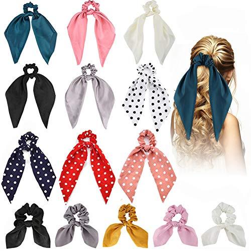 - 3 Styles in 1 Set: The satin silk scarf hair scrunchies set comes with 5 solid colors long scarf scrunchies & 5 solid colors bunny ear bowknot scrunchies and 4 polka dots chiffon scrunchies for hair.