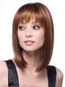 Description: Fashion-forward straight look with center part and blunt fringe. Length: Fringe 3.5, Crown 13, Nape 6.5 Cap Size: Average