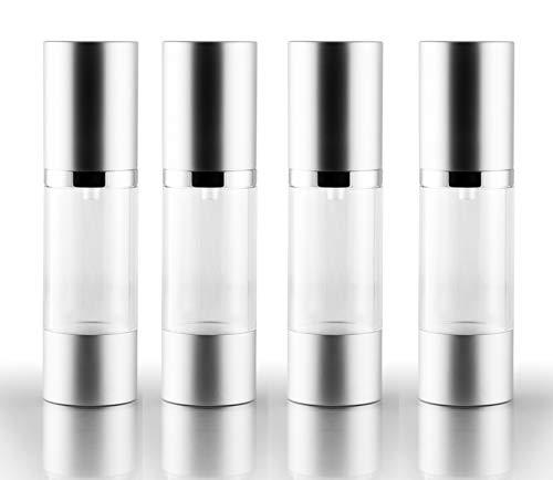 - Includes 4 - 30ml/1 oz Clear, refillable airless pump bottles with matte silver aluminum base and caps.